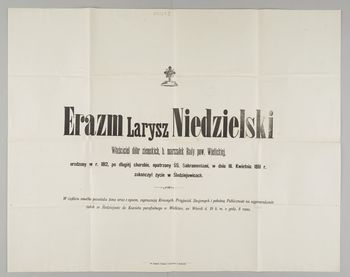 [Nekrolog. Incipit] Erazm Larysz Niedzielski Właściciel dóbr ziemskich, b. marszałek Rady pow. Wielickiej, [...]