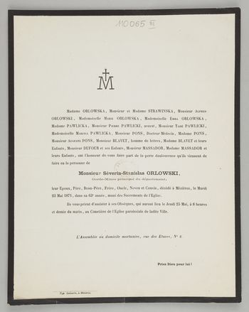 [Nekrolog. Incipit] M Madame Orlowska, Monsieur et Madame Strawinska [...] Monsieur Séverin-Stanislas Orlowski, [...]