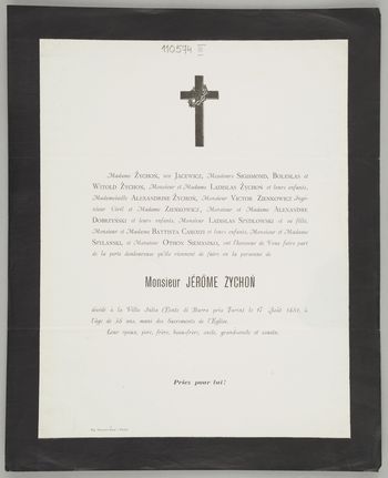 [Nekrolog. Incipit] Madame Żychoń, née Jacewicz, [...] Monsieur Jĕrome Żychoń [...]
