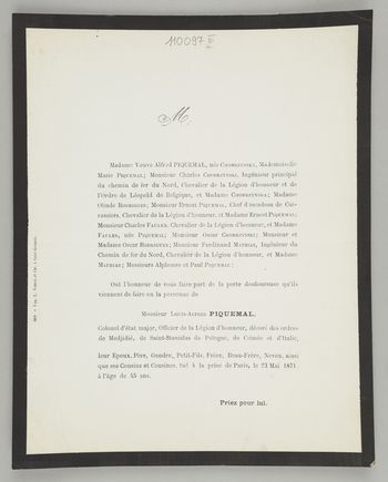 [Nekrolog. Incipit] M Madame Veuve Alfred Piquemal, née Chobrzynska [...] Monsieur Louis Alfred Piquemal, Colonel d'état major, [...]