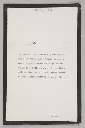 [Nekrolog. Incipit] M L'Oeuvre de Saint-Vincent-de-Paul [...] madame la Comtesse Delphine Potocka, membre de l'Oeuvre [...]