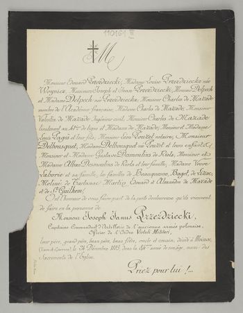 [Nekrolog. Incipit] Monsieur Edouard Przezdziecki, Madame Louise, [...] Monsieur Joseph Janus Przezdziecki, Capitaine-Commandant d'Artillerie de l'ancienne armée polonaise [...]