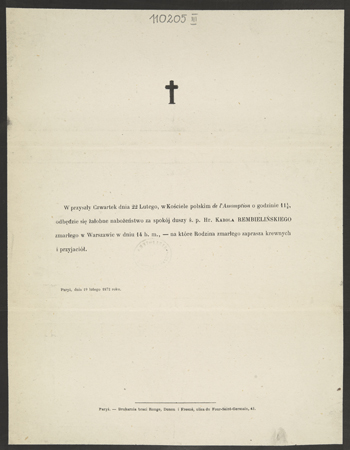 [Nekrolog. Incipit] W przyszły czwartek dnia [...] ś. p. Hr. Karola Rembielińskiego [...]