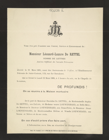 [Nekrolog. Incipit] Vous êtes prié d'assister aux Convoi [...] Monsieur Léonard-Lazare De Rettel Homme de Lettres [...]