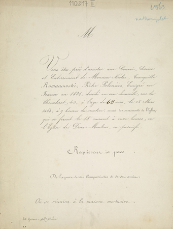 [Nekrolog. Incipit] M Vous êtes prié d'assister aux Convoi [...] Monsieur Nicolas, Tranquille Romanowski, Pretre Polonais [...]