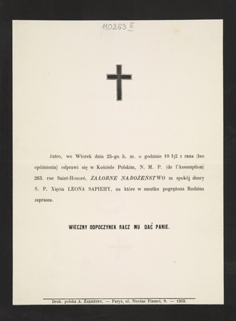 [Nekrolog. Incipit] Jutro, we Wtorek [...] Ś. P. Xięcia Leona Sapiehy [...]