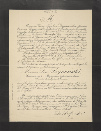 [Nekrolog. Incipit:] M Madame Veuve Napoléon Szymańska, [...] Monsieur Louis Szymanski, Lieutenent au 8ème Régiment d'Infanterie de Marine [...]