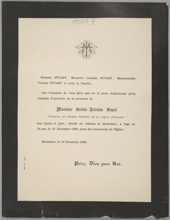 [Nekrolog. Incipit:] Madame Stuart, Monsieur Ladislas Stuart [...] Monsieur Käetan - boleslas Stuart Capitaine en retraite chevalier de la Légion d'honneur, [...]
