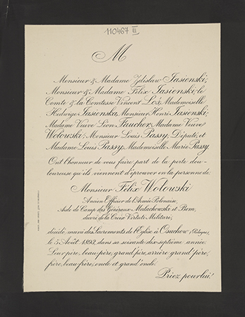 [Nekrolog. Incipit] M Monsieur et Madame Zdzislaw Jasienski [...] Monsieur Félix Wolowski Ancien Officier de l'Armée Polonaise, [...]