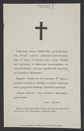 [Nekrolog. Incipit] Pułkownik Teofil Zabłocki, ozdobiony krzyżem Virtuti militari [..]