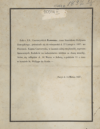 [Nekrolog. Incipit] Zofia z XX. Czartoryskich Zamojska, żona Stanisława Ordynata Zamojskiego [...]