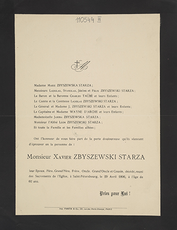 [Nekrolog. Incipit] M Madame Zbyszewski Starza, [...] Monsieur Xavier Zbyszewski Starza, leur epoux, [...]
