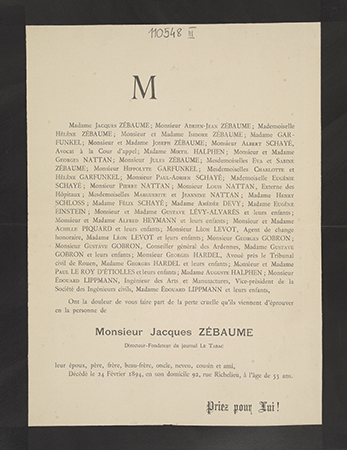 [Nekrolog. Incipit] M Madame Jacques Zébaume, [...] Monsieur Jacques Zébaume, Directeur-Fondateur du journal Le Tabac, leur époux [...]