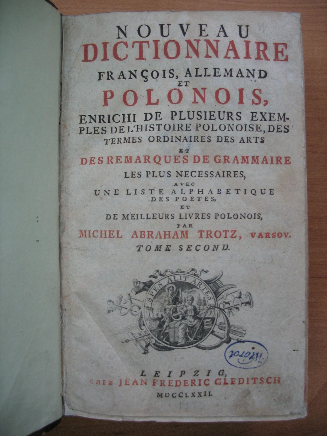 Nouveau dictionnaire françois allemand et polonois enrichi de plusieurs exemples de l`histoire polonoise des termes ordinaires des arts et des remarques de grammaire les plus necessaires avec une liste alphabetique des poetes et de meilleurs livres polonois