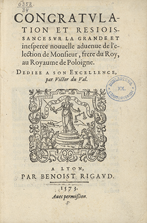 Congratvlation et resioissances svr la grande et inesperee nouuelle aduenue de l'election de Monsieur, frere du Roy, au Royaume de Poloigne
