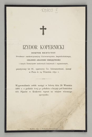 [Nekrolog. Incipit] Izydor Kopernicki Doktor Medycyny Profesor nadzwyczajny Uniwersytetu Jagiellońskiego [...]