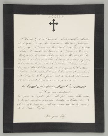 [Nekrolog. Incipit] Le Comte Gustave Ostrowski, [...] Comtesse Clémentine Ostrowska née Comtesse née Comtesse Mostowska leur épouse [...]