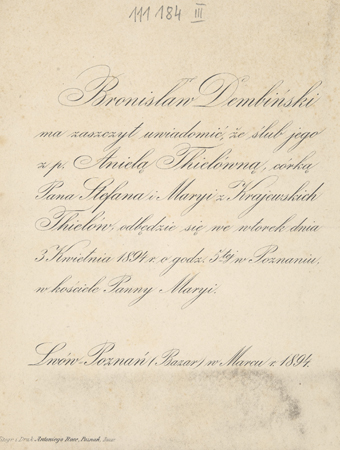 [Zaproszenie. Incipit] Bronisław Dembiński ma zaszczyt uwiadomić [...]