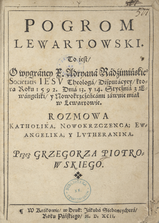 Pogrom lewartowski to iest o wygraney X. Adryana Radzimińskie[go] Societatis Iesv theologa disputacyey ktora roku 1592 dnia 13 y 14 stycznia z ewangeliki y nowokrzczeńcami iawnie miał w Lewartowie