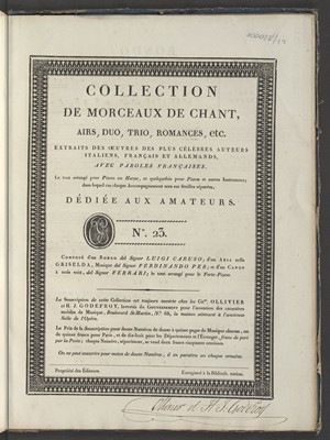 | Wydane w seriach: | Collection de morceaux de chant airs, duo, trio , romances,etc arrangé pour piano ou harpe extraits des oeuvres [...] avec paroles françaises |