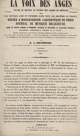 | Inne tytuły: | Journal de musique religieuse choix de chants anciens et modernes, français et éntrangers au caractére religieux, également admissibles a l'église et au salon des confreries du Saint-Sacrement, de La Sainte Vierge et du rosaire ou autres associations religieuses prières, invocations, méditations, mélodies, romances pieuses, musique sacrée solos, duos, trios, quatuors et choeurs a l'usage des séminaires, des maisons claustrales et d'éducation La Voix des Anges (Oeuvre de secours en faveur des caisses de retratite) 1.re année |