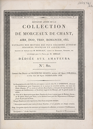 | Wydane w seriach: | Collection de morceaux de chant airs, duo, trio, romances, etc. Extraits des oeuvres des plus célèbres auteurs [...], traduits en français par M. Desriaux [...] et arrangés pour le piano par Thollé |