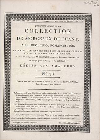| Wydane w seriach: | Collection de morceaux de chant airs, duo, trio, romances, etc. Extraits des oeuvres des plus célèbres auteurs [...], traduits en français par M. Desriaux [...] et arrangés pour le piano par Thollé |