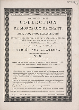 | Wydane w seriach: | Collection de morceaux de chant airs, duo, trio, romances, etc. Extraits des oeuvres des plus célèbres auteurs [...], traduits en français par M. Desriaux [...] et arrangés pour le piano par Thollé |