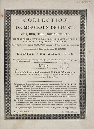 | Wydane w seriach: | Collection de morceaux de chant airs, duo, trio, romances,etc arrangé pour piano ou harpe par Thollé extraits des oeuvres [...] avec paroles françaises |