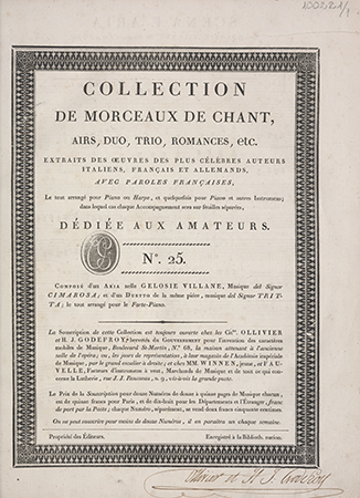 | Wydane w seriach: | Collection de Morceaux de Chant Collection de morceaux de chant, airs, duo, trio, romances, etc. Extraits des oeuvres des plus célèbres auteurs [...] avec paroles françaises, le tout arrangé pour piano ou harpe et quelquefois pour piano [...] |