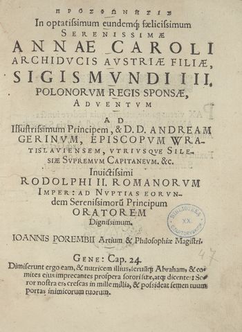 AEAA. Prosphonesis in... Annae Caroli archiducis Austriae filiae, Sigismvndi III Polonorvm Regis sponsae adventvm...