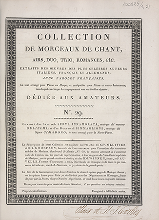 | Wydane w seriach: | Collection de morceaux de chant Collection de morceaux de chant, airs, duo, trio, romances, etc. Extraits des oeuvres des plus célèbres auteurs [...] avec paroles françaises, le tout arrangé pour piano ou harpe et quelquefois pour piano [...] |