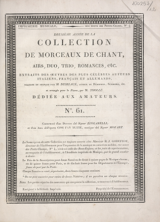 | Wydane w seriach: | Collection de morceaux de chant Collection de morceaux de chant, airs, duo, trio, romances, etc. Extraits des oeuvres des plus célèbres auteurs [...], traduits en français par M. Desriaux et arrangés pour le piano par Thollé |