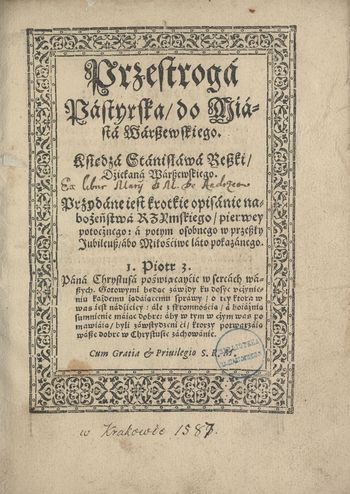 Przestroga Pastyrska, do Miasta Warszewskiego [...] Przydane iest krotkie opisanie nabożeństwa Rzymskiego, pierwey potocznego