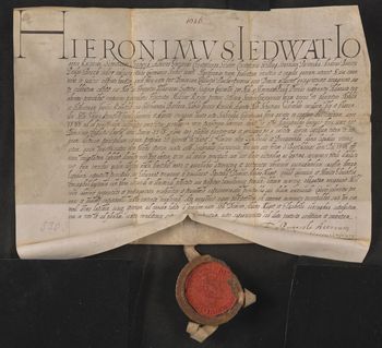 Ławnicy miasta Krakowa poświadczają, że ławnik krakowski Melchior Rezler jako pełnomocnik Jana, Barbary i Agnieszki - dzieci oraz Agnieszki - żony Szymona Krumfelta niegdyś rajcy krakowskiego w imieniu swoich mocodawców sprzedał kamienicę przy ulicy Floriańskiej (między kamienicą Tymlowską i Pernusowską) rajcy krakowskiemu Adamowi Nagotowi i żonie jego Elżbiecie