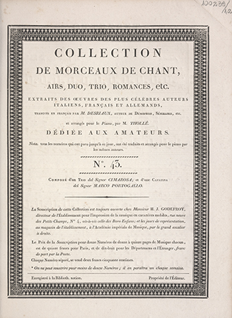 | Wydane w seriach: | Collection de morceaux de chant Collection de morceaux de chant, airs, duo, trio, romances, etc. Extraits des oeuvres des célèbres auteurs [...] traduits en français par M. Desriaux, arrangé pour le piano par Thollé |