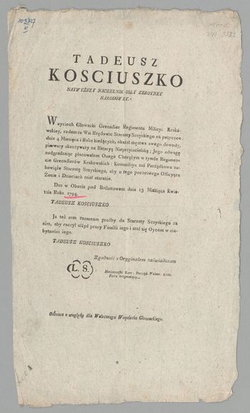 Tadeusz Kosciuszko Naywyższy Naczelnik Siły Zbroyney Narodowey