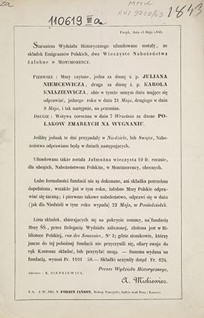 [Zawiadomienie o nabożeństwie. Incipit]: Staraniem Wydziału Historycznego ufundowane zostały, ze składek Emigrantów Polskich, dwa Wieczyste Nabożeństwa w Montmorency [...]