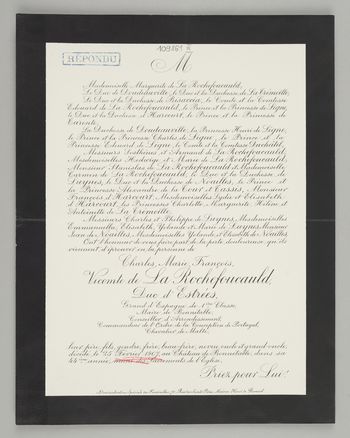 [Nekrolog. Incipit] M Mademoiselle Marguertite de La Rochefoucauld, [...] Charles Marie François Vicomte de La Rochefoucauld, [...]