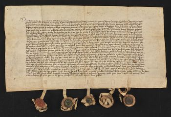Bodzanta arcybiskup gnieźnieński, Sędziwój wojewoda kaliski i starosta krakowski oraz trzej inni pełnomocnicy Władysława króla polskiego oznajmiają, że ustalili z wielkim komturem Konradem von Wallenrode i innymi przedstawicielami Zakonu Krzyżackiego, iż na granicy Królestwa Polskiego i ziem Zakonu, między wsiami Kostrin i Czerniewiec naprzeciw grodu Złotoria, został wyznaczony na dzień 12 kwietnia tego roku zjazd Władysława króla polskiego i wielkiego mistrza krzyżackiego, w czasie trwania którego - za poręczeniem obu stron - ma panować pokój na ziemiach Litwy, Rusi i Zakonu