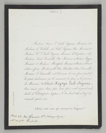 [Nekrolog. Incipit] Madame Veuve J. Lach-Szyrma, [...] Monsieur le Colonel Krystyn Lach-Szyrma, leur mari [...]
