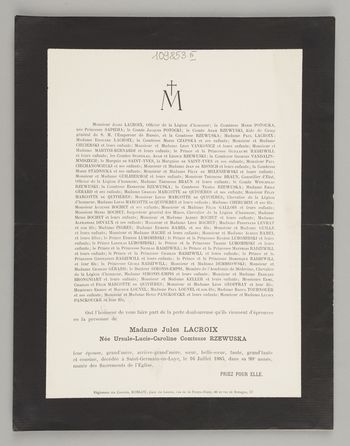 [Nekrolog. Incipit] Monsieur Jules Lacroix, [...] Madame Jules Lacroix Née Ursule-Lucie-Caroline Comtesse Rzewuska leur épouse [...]