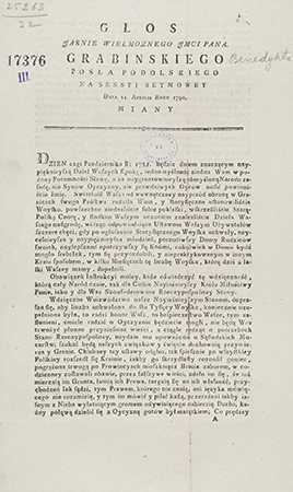 Głos Jasnie Wielmoznego Jmci Pana. Grabinskiego starosty posła podolskiego na Sessyi Seymowey Dnia 11. Aprilis Roku 1791. Miany