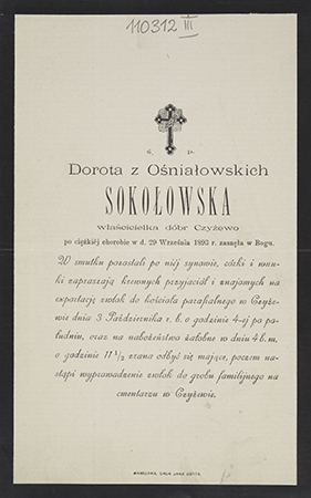 [Nekrolog. Incipit:] ś. p. Dorota z Ośniałowskich Sokołowska właścicielka dóbr Czyżewo [...]