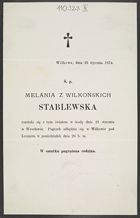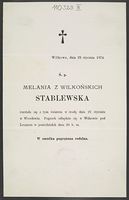 [Nekrolog. Incipit:] Ś. p. Melania z Wilkońskich Stablewska rozstała [...]