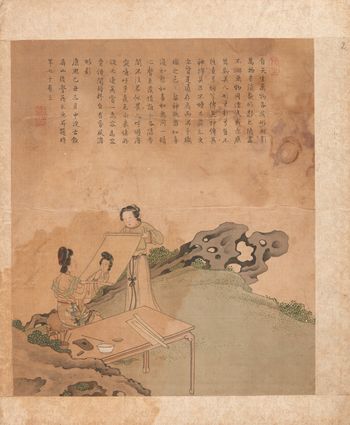 Akwarela z malarką prezentującą obraz pozującej do niego damie