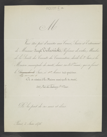 [Nekrolog. Incipit] M Vous êtes prié d'assister aux Convoi [...] Monsieur Joseph Télesińki, professeur de violon, [...]