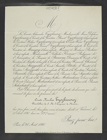 [Nekrolog. Incipit] M Le Comte Alexandre Tyszkiewicz, [...] Comte Nicolas Tyszkiewicz, Chambellan de S. M. l'Empereur de Russie, leur père [...]