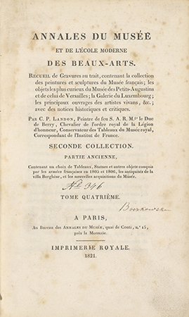 contenant un choix des tableaux, statues et autres objets de curiosité conquis par les armées françaises en 1805 et 1806, les antiquités de la villa Borghèse, et les nouvelles acquisitions du Musée Napoléon
