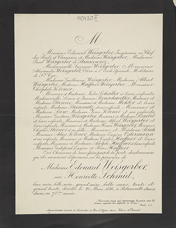 [Nekrolog. Incipit] M Monsieur Edouard Weisgerber, Ingénieur [...] Madame Edouard Weisgerber, née Henriette Schmid, leur mère [...]